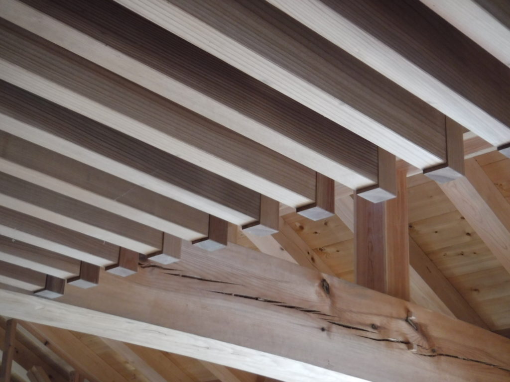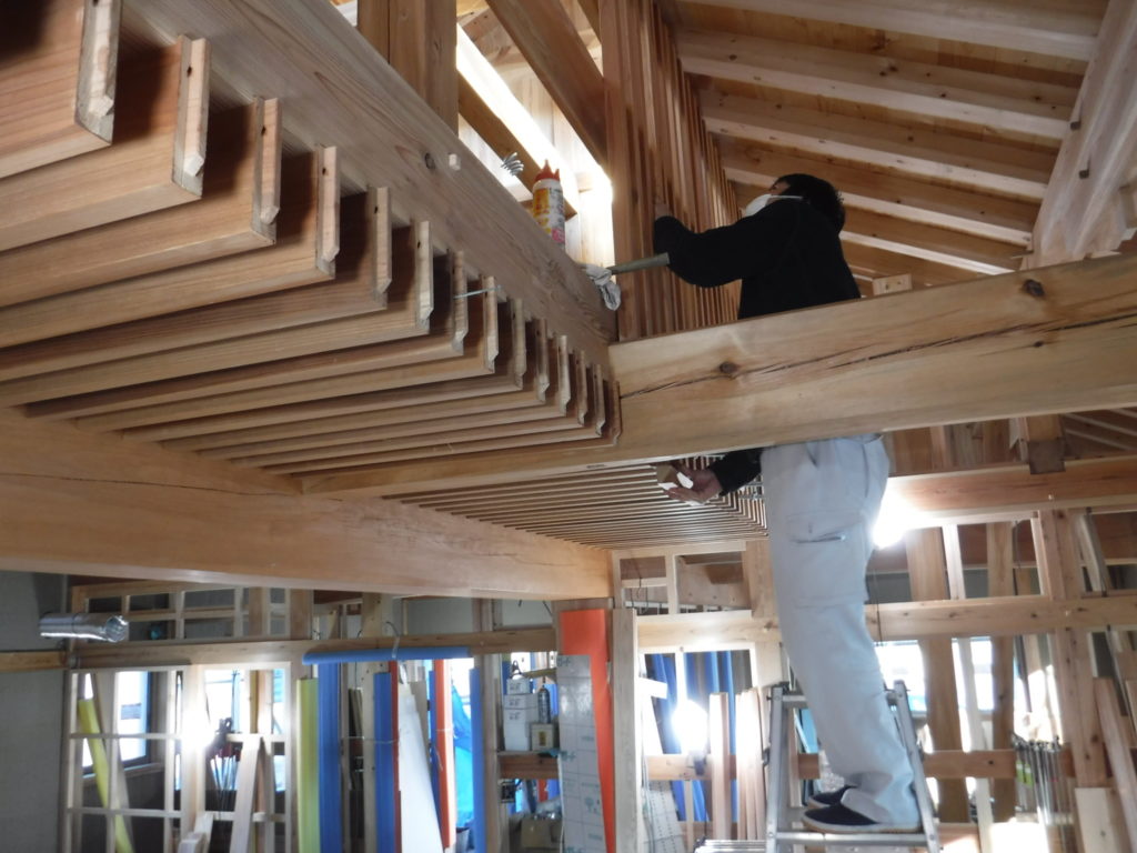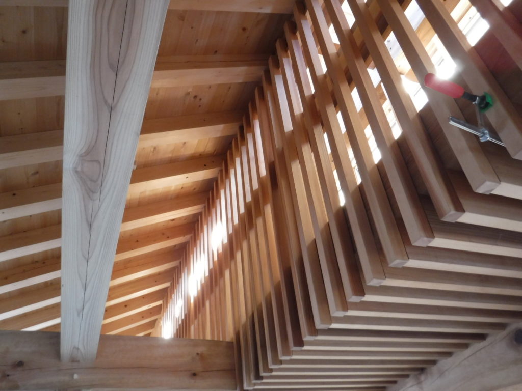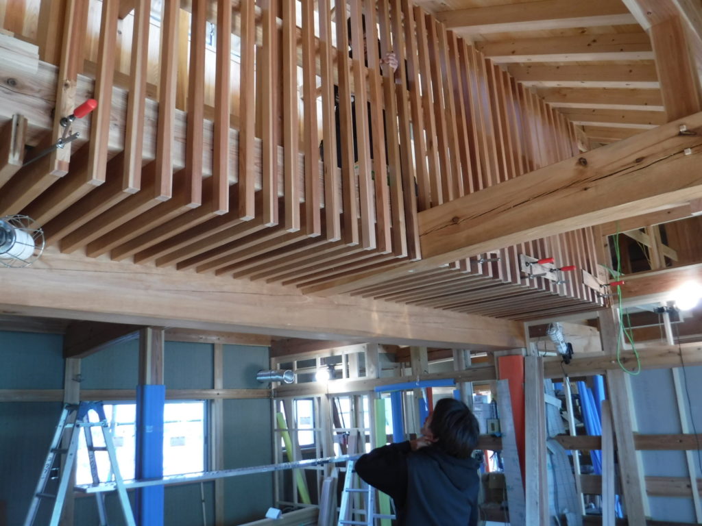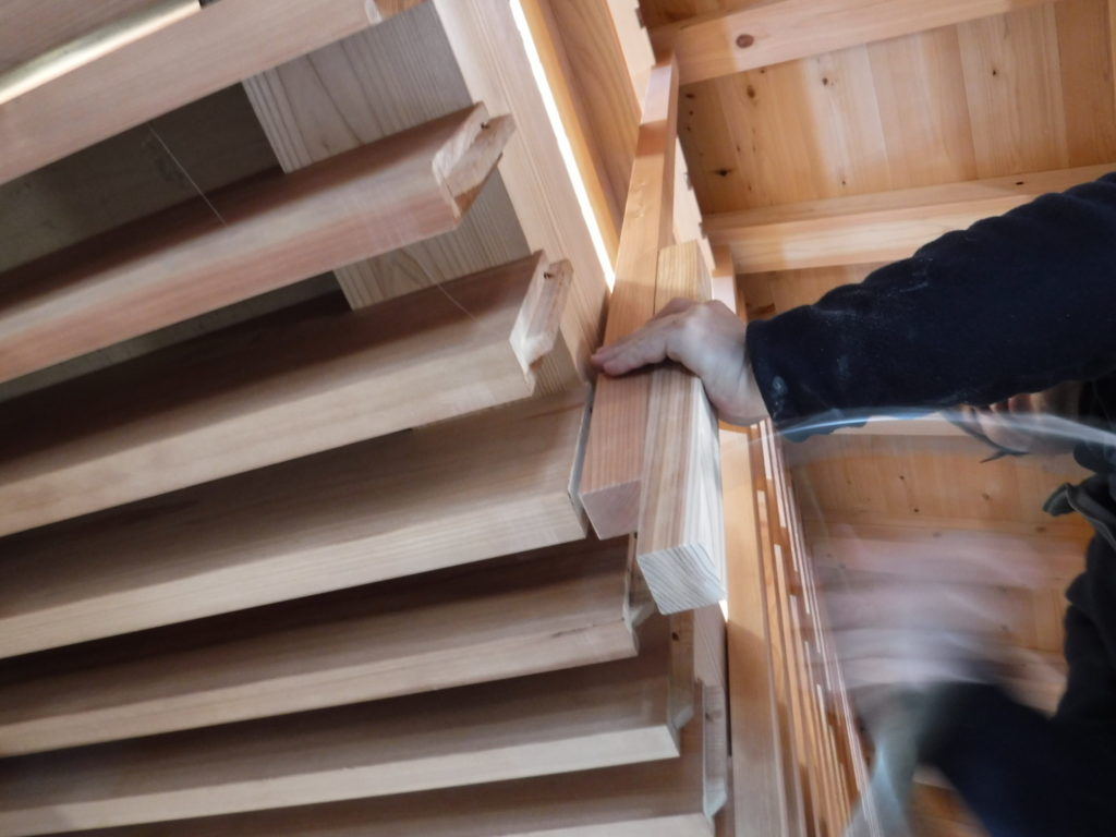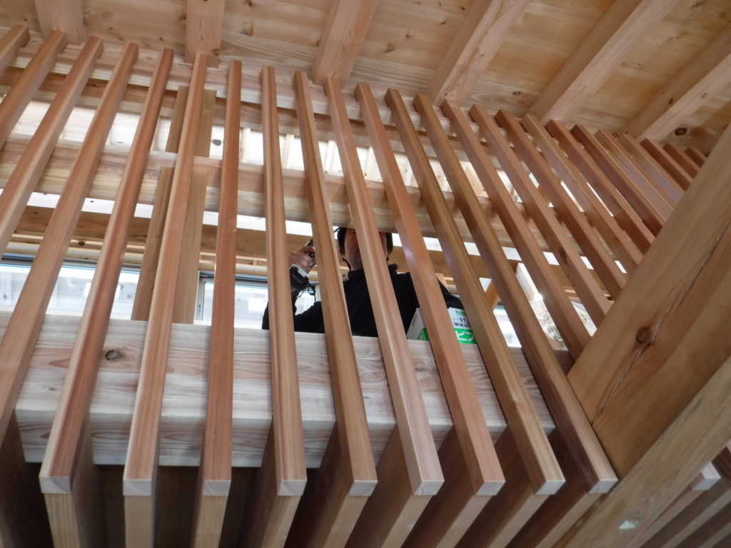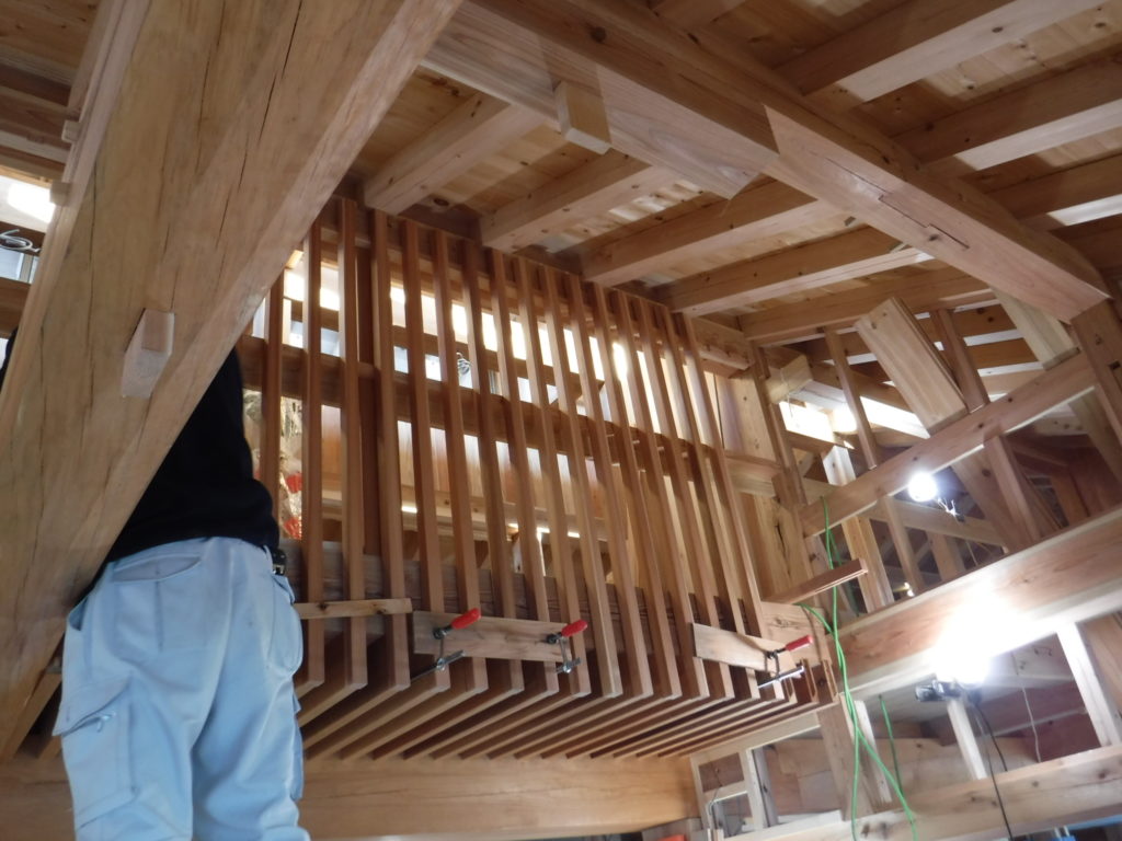 天秤板の格子取り付けが始まりました